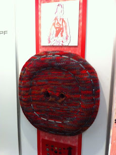 I saw this while we were setting up, one of the stands has a giant knit button! There are many other interesting displays, I'll try to take a few pictures of them tomorrow before the show is over.Here are pictures of the Lotus Yarns stand. On the left is a rainbow of the pure cashmere which is very soft and luxurious. On the back wall on the far left is the Autumn Wind, a cotton cashmere, and below the shawl is the Moon Night, which is a lambswool and cashmere lace yarn. Handing on the rack at the back is the Bamboo Soft.